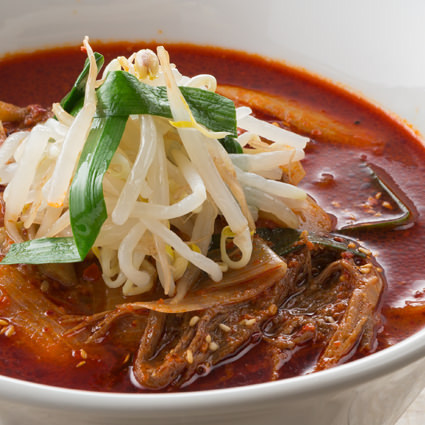 將牛肉和多種蔬菜煮製,再在用韓國紅辣椒醬入味的湯裡放入麵的料理。